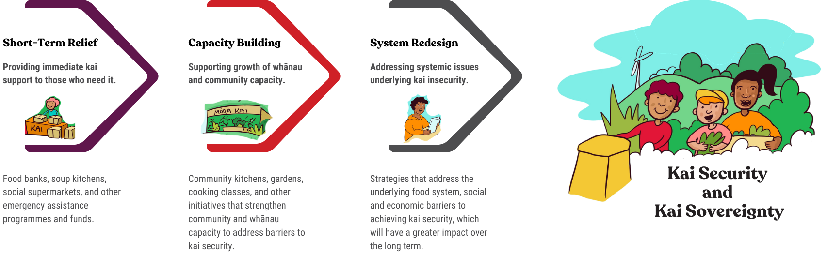 The Community Food Security Continuum shows how kai security spans short-term relief, building whānau and community capacity, and long-term system change. Our work begins with meeting immediate needs while working across the continuum over time.