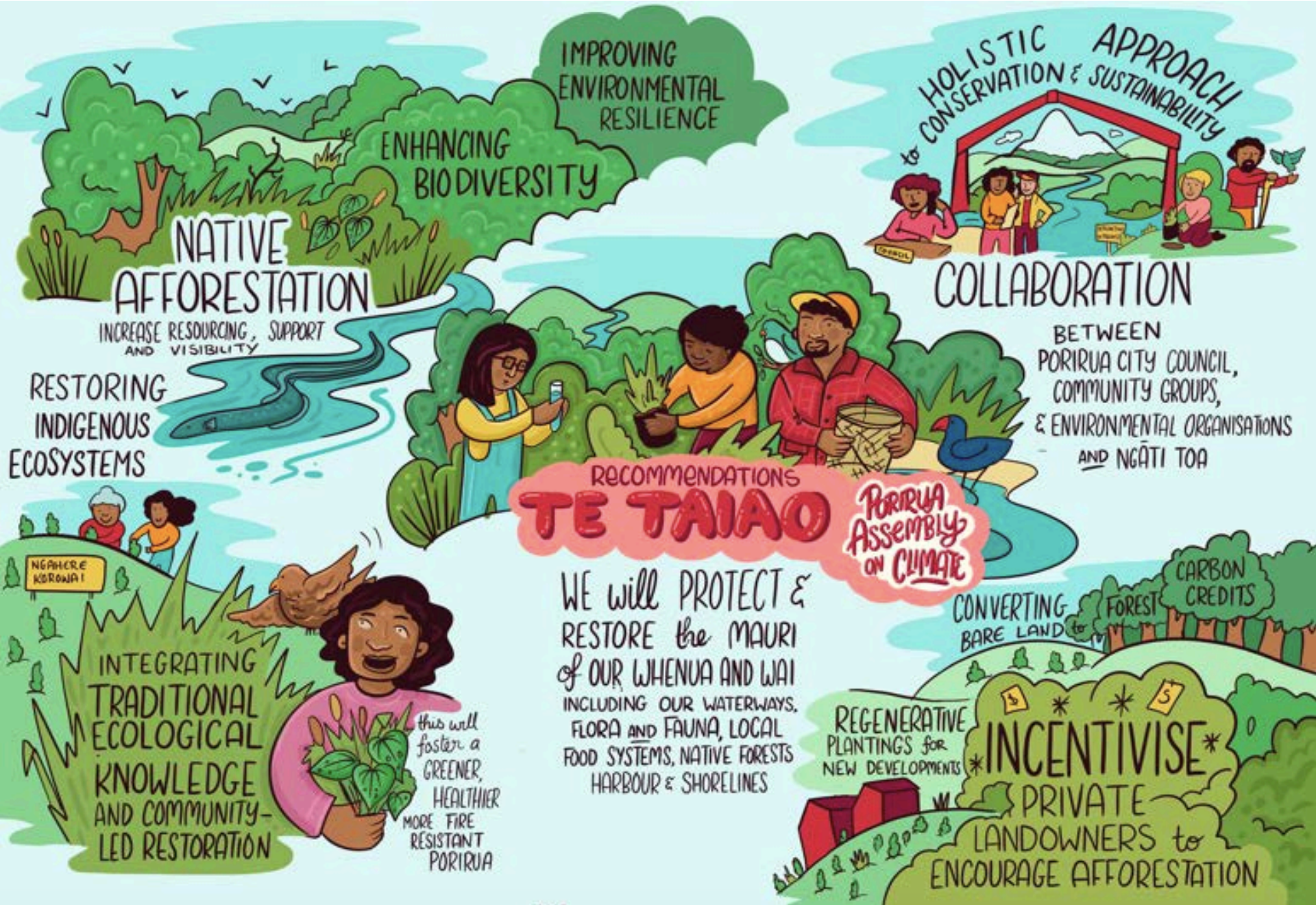 Protect and restore the mauri of our whenua, taonga and our wai, including our waterways, flora and fauna, local food systems, native forests, harbour and shorelines.